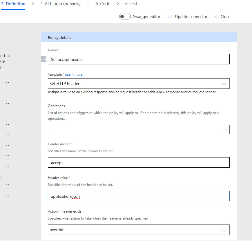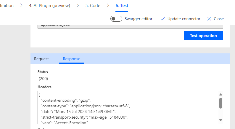 When sending requests from the connector “test operation” Power Automate included an “accept” header saying it wanted a JSON response: